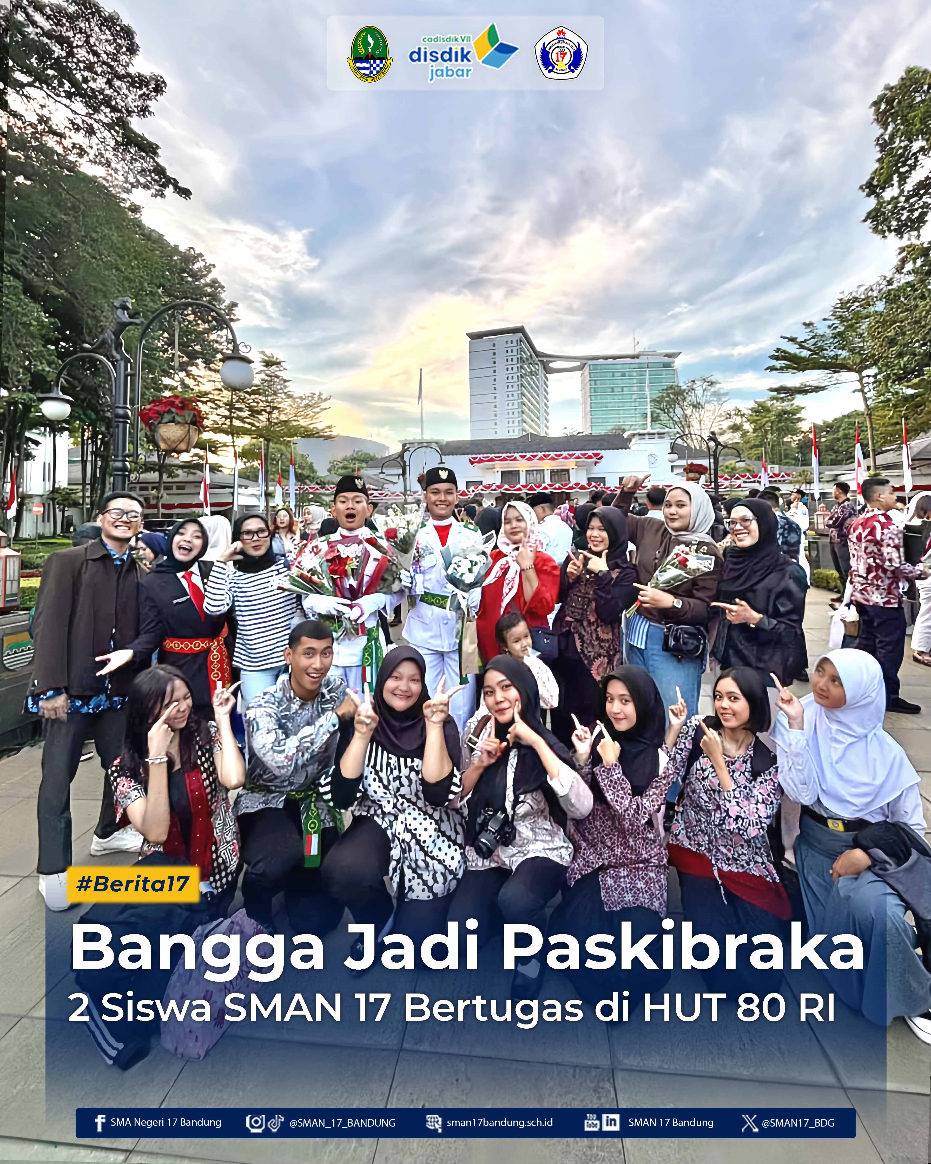 Upacara Hari Ulang Tahun ke-80 Republik Indonesia di Plaza Balai Kota Bandung, menjadi momen bersejarah bagi siswa SMAN 17 Bandung. Dua perwakilan sekolah, Raditya Supyadi (XI-C) dan Irwan Aryana (XI-E), terpilih sebagai bagian dari Paskibraka (Pasukan Pengibar Bendera Pusaka) Kota Bandung.