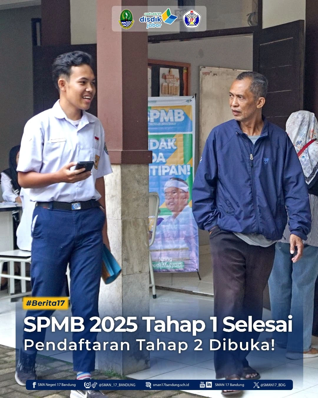 Sistem Penerimaan Murid Baru (SPMB) Jawa Barat Tahap 1 untuk SMAN 17 Bandung telah tuntas dilaksanakan. Calon peserta didik yang dinyatakan lolos pada tahap pertama telah menyelesaikan proses daftar ulang pada 20-23 Juni 2025. Kehadiran dan antusiasme tinggi calon siswa selama proses daftar ulang menunjukkan semangat mereka untuk bergabung dengan SMAN 17 Bandung.
