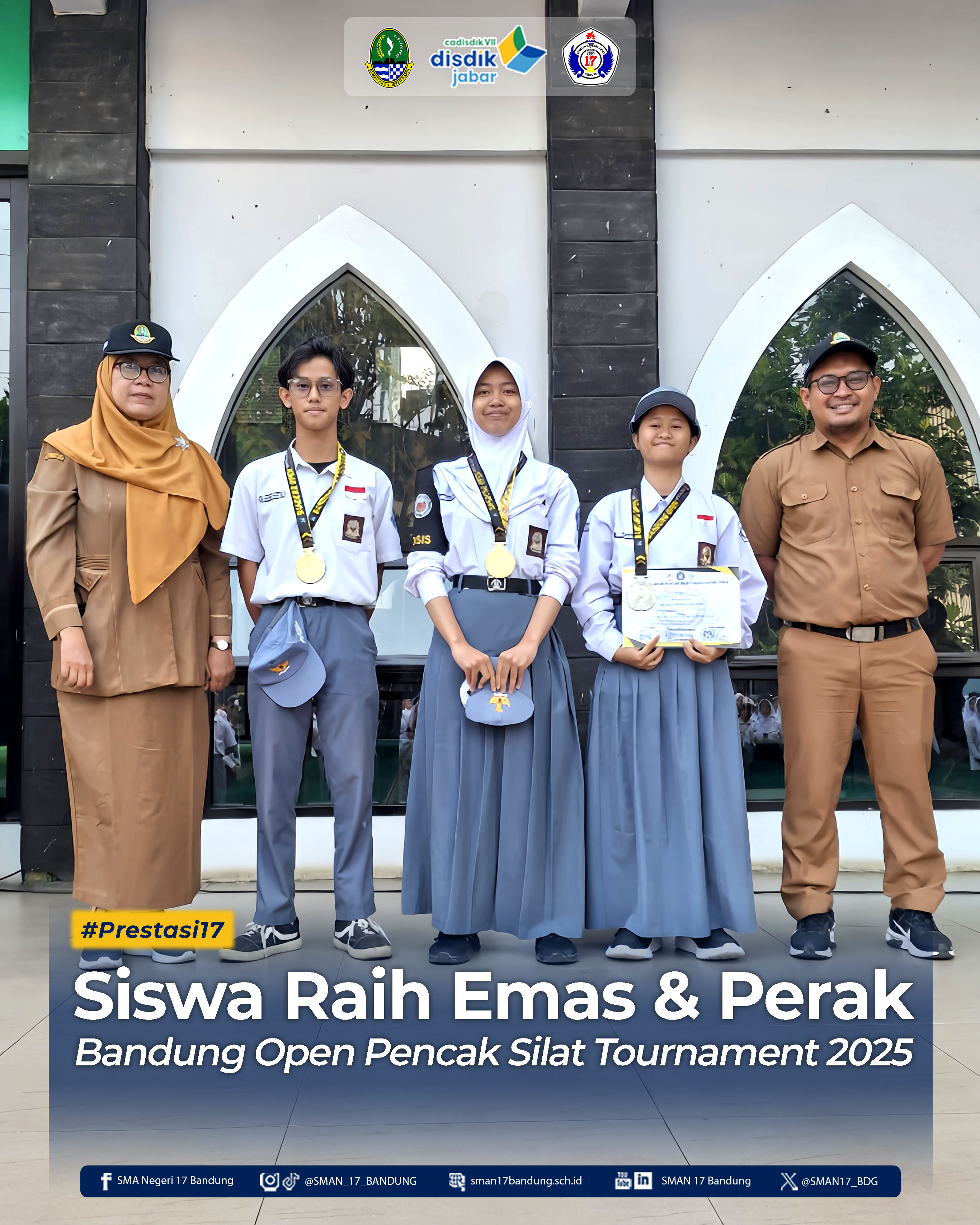 Tiga siswa SMAN 17 Bandung sukses menorehkan prestasi di Bandung Open Pencak Silat Tournament 2025. Kegiatan ini digelar pada 6–10 Agustus 2025 di GOR KONI Bandung oleh IPSI (Ikatan Pencak Silat Indonesia) Kota Bandung.