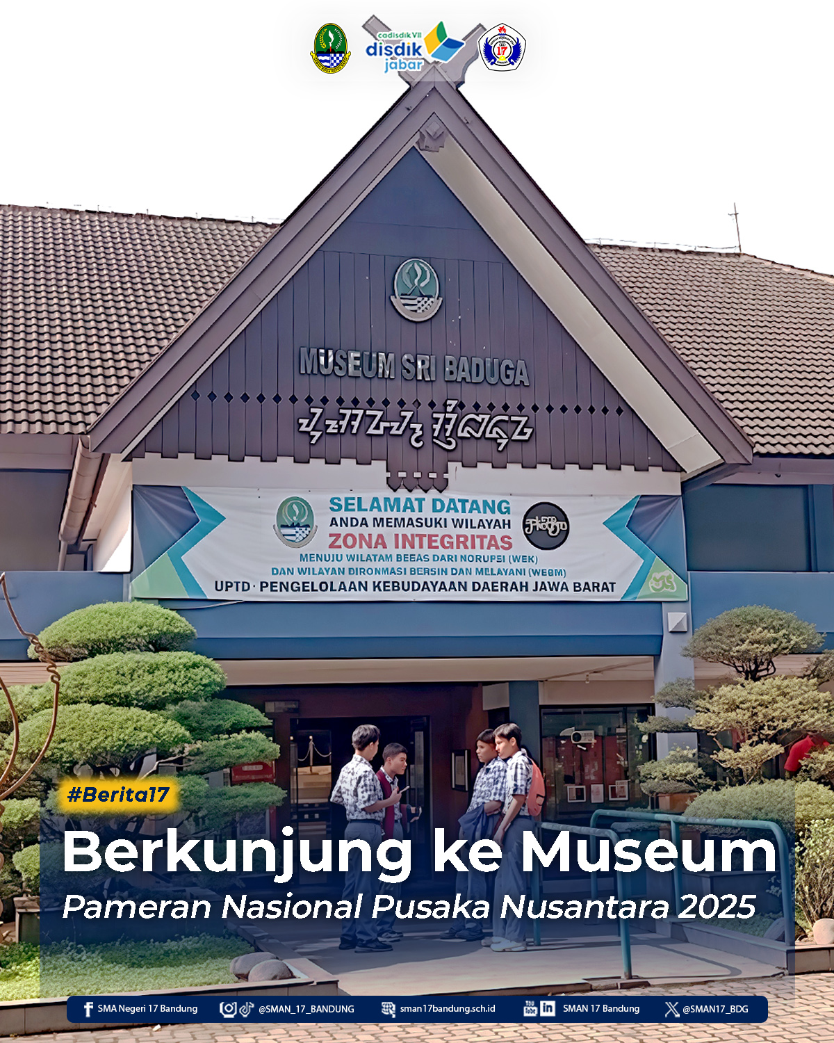 Pada Kamis, 31 Oktober 2025, seratus peserta didik SMAN 17 Bandung melaksanakan kegiatan kunjungan edukatif ke Museum Negeri Sri Baduga, Kota Bandung. Kegiatan ini merupakan bagian dari dukungan sekolah terhadap upaya pelestarian dan pengenalan kebudayaan bangsa melalui kegiatan Pameran Nasional Pusaka Nusantara Tahun 2025 yang diselenggarakan oleh Dinas Pariwisata dan Kebudayaan Provinsi Jawa Barat.