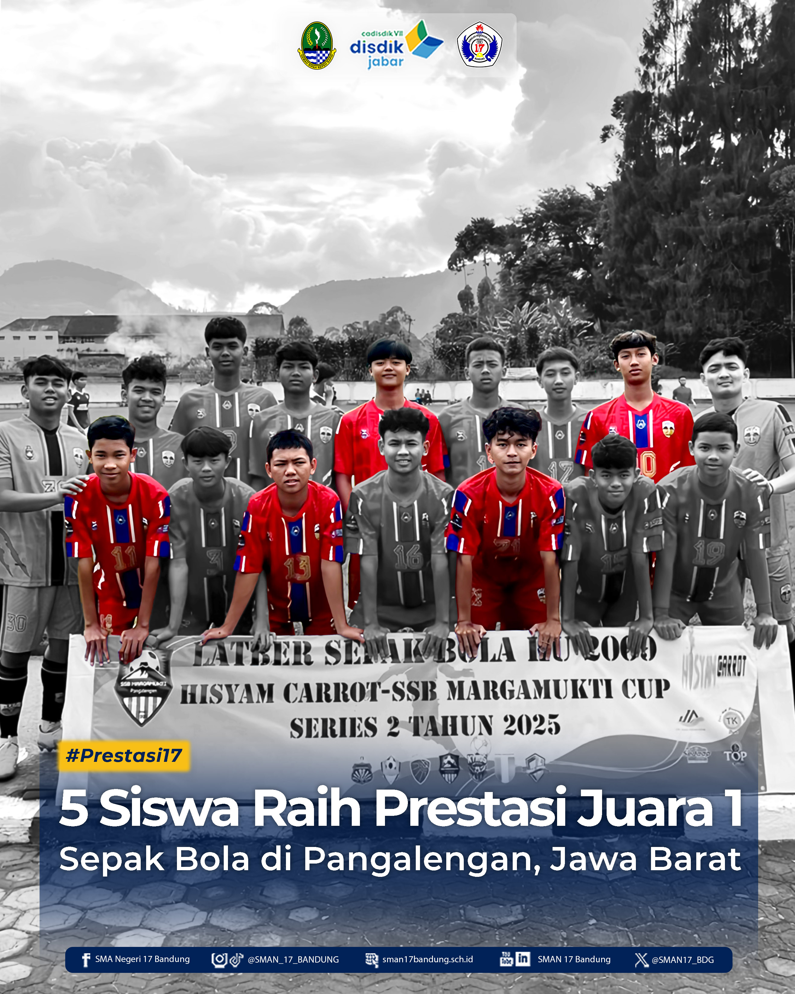 Prestasi membanggakan kembali diraih oleh lima siswa SMAN 17 Bandung yang berpartisipasi bersama salah satu klub sepak bola dalam ajang Latber SSB Margamukti KU 2009 Series 2 2025 (Anniversary Klub). Kompetisi antar klub tersebut berlangsung pada 22 November 2025 di Lapangan Desa Margamukti, Pangalengan.