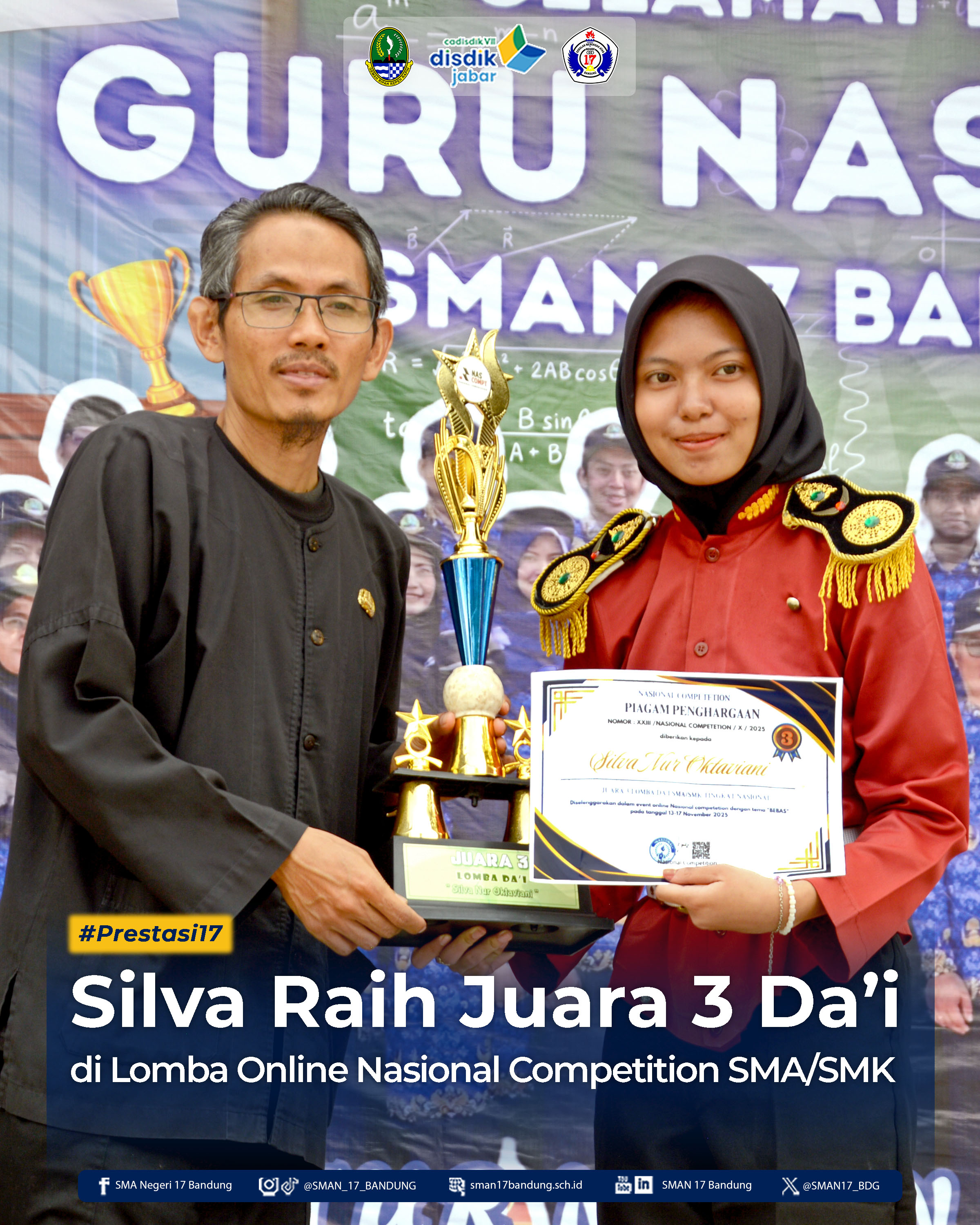 SMAN 17 Bandung kembali menorehkan prestasi membanggakan di tingkat nasional. Salah satu siswa, Silva Nur Oktaviani (X-J), berhasil meraih Juara 3 dalam ajang Lomba Dai SMA/SMK Tingkat Nasional yang berlangsung pada 13–17 November 2025. Kompetisi ini diselenggarakan oleh Nasional Competition secara online (dalam jaringan) dengan mengangkat tema “BEBAS."